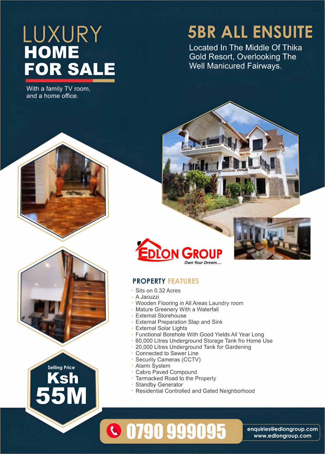 A 5BR all-en-suite family villa with a detached Dsq, a family TV room, and a home office located in the middle of Thika Greens Golf Resort, overlooking the well-manicured fairways. Features include: