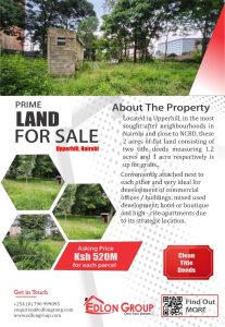 Located in the most sought-after neighborhood in Nairobi and close to NCBD. These 2 acres of flat land consisting of two title deeds measuring 1.2 acres and 1 acre, respectively. But ideally attached next to each other is very ideal for the development of a commercial building/offices, mixed use development, hotel or boutique high-rise apartments due to its strategic location.