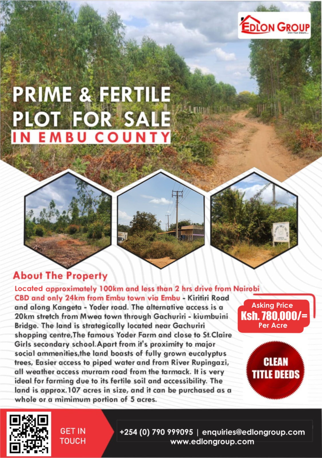 For Sale: A Prime and fertile land in Embu County, approximately 100km and less than 2 hrs. drive from Nairobi CBD and only 24km from Embu town via Embu-Kiritiri road along Kangeta-Yoder Road the alternative access is a 20km stretch from Mwea town through Gachuriri-Kiumbuini Bridge. the land is strategically located near Gachuriri shopping Centre, the famous Yoder Farm and close to St. Claire Girls secondary school. Apart from its proximity to major social amenities, the land boosts of fully grown eucalyptus trees, Easier access to piped water and from river Rupingozi,all weather access murram road from the tarmac. It is very ideal for farming due to its fertile soil and accessibility. The land is approx,107 acres in size, and it can be purchased as a whole or a minimum portion of 5 acres.
