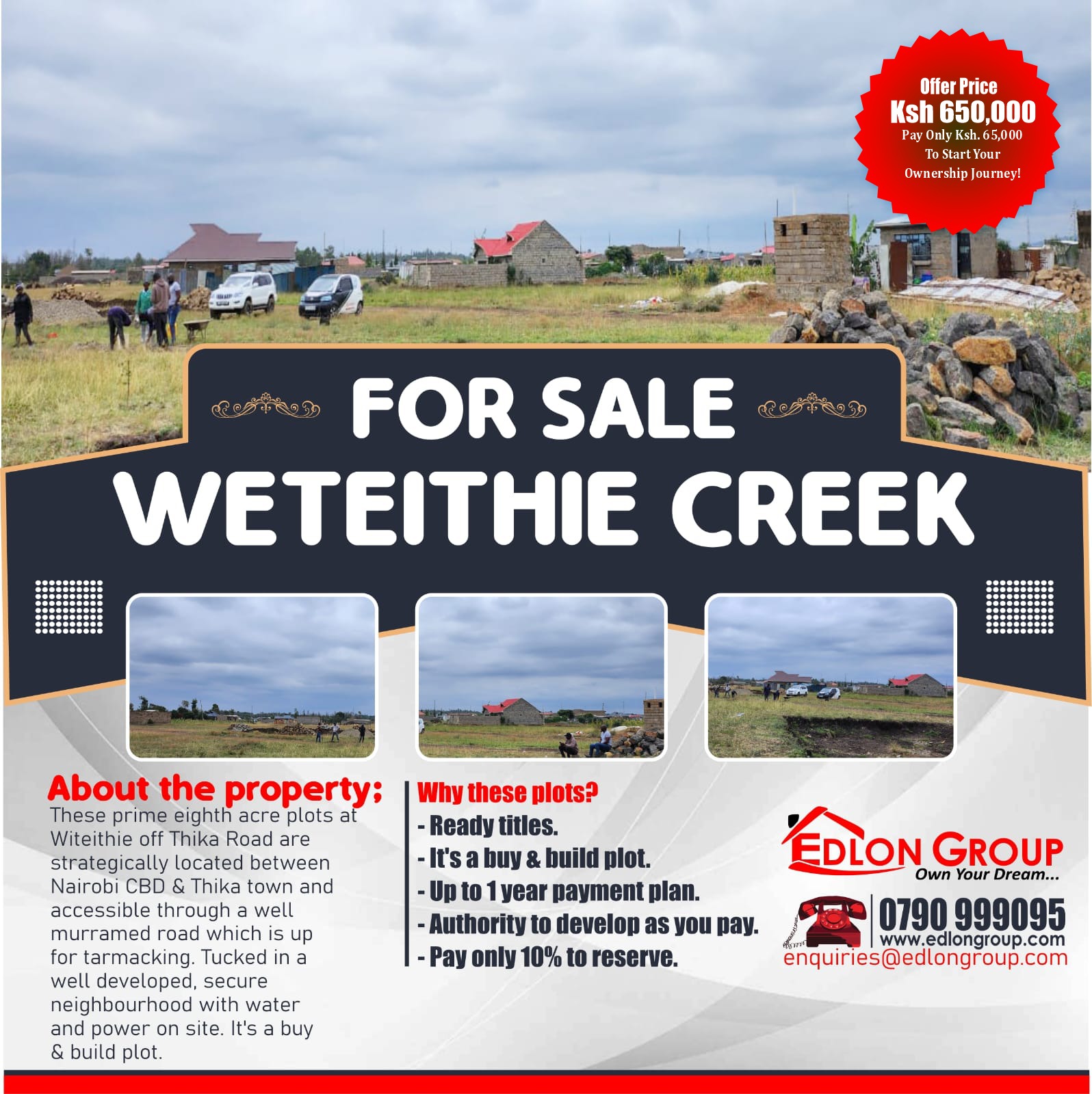 These prime plots eighth acre plots at weiteithie off Thika road are strategically located between Nairobi CBD and Thika town and accessible through a well murramed road which is up for tarmacking. Tucked in a well-developed, secure neighborhood with water and power on site. It’s a buy and build plot.